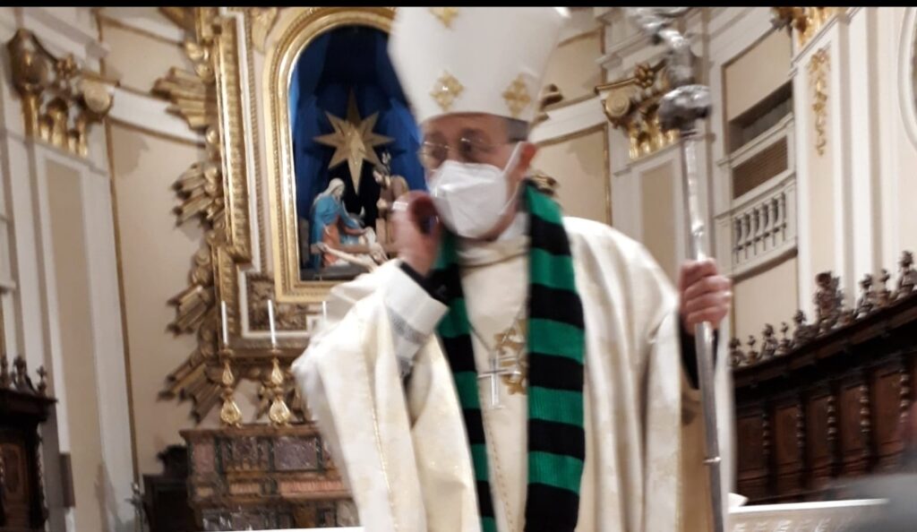 Come un ultrà. Incredibile e bello. L’Arcivescovo con sciarpa neroverde al collo donatagli dal presidente del Chieti Antonio Mergiotti e dal presidente del Comitato per il Centenario, Stefano Marchionno. E’ stata questa