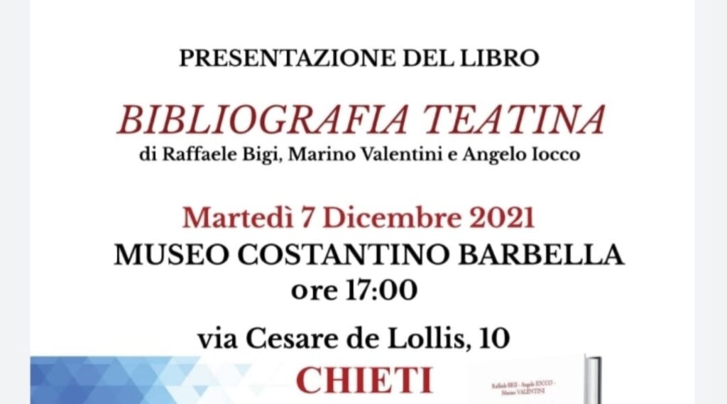 Arriva la presentazione di “Bibliografia Teatina” di Raffaele Bigi, Angelo Iocco e Marino Valentini. Una copia del nuovo e qualificato impegno editoriale dei tre autori teatini sarà messo a disposizione di studenti