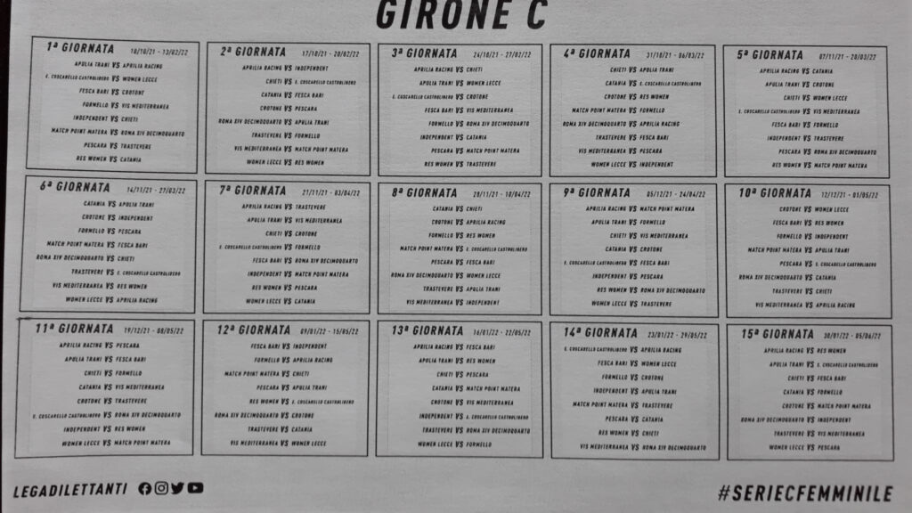 E’ stato reso noto il calendario della serie C del campionato di calcio femminile. La stagione partirà il 10 ottobre e le ragazze neroverdi saranno di scena a Napoli (campo di Mugnano)