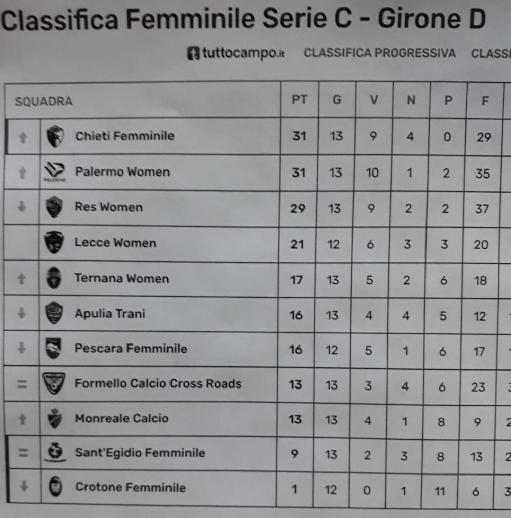 Nessuna sorpresa nel campionato di serie C (girone D) di calcio femminile. Il Chieti ha piegato la resistenza della Ternana (1-0) con un gol di Alice Ferrazza nel primo tempo. Il Palermo