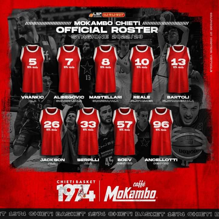 Assegnati, dal 5 di Vrankic al 96 di Ancellotti, i numeri ufficiali del roster targato Caffè Mokambo Chieti Basket. che inizierà la preparazione il prossimo 18 agosto (il via al campionato è