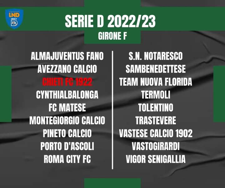 E’ ufficiale la composizione del Girone F di serie D. Raggruppamento geograficamente ancora composto da abruzzesi, laziali, molisane e da una formazione campana. In dettaglio. 5 abruzzesi (Avezzano, Chieti, Pineto, Notaresco, Vastese);