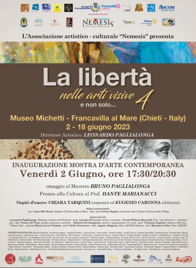 E’ in programma per venerdì 2 giugno 2023 alle ore 17,30 al Museo Michetti di Francavilla al Mare (piazza San Domenico, 1) il vernissage della mostra “La libertà nelle arti visive 4 e non solo…” organizzata dall’Associazione artistico-culturale “Nemesis” e moderato da Florena Iavarone.