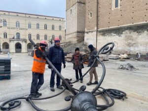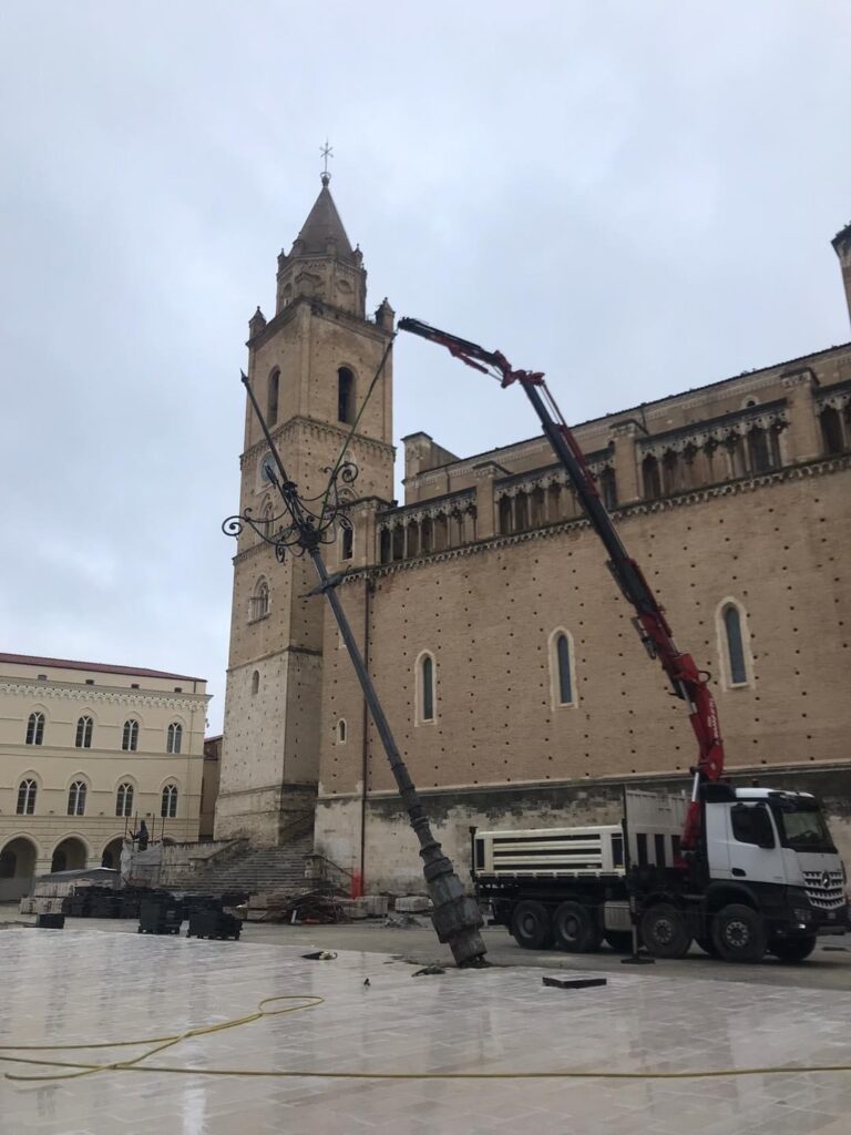 Rimosso il primo dei due lampioni storici di piazza San Giustino a Chieti. Sul posto l’assessore ai Lavori pubblici Stefano Rispoli con uno dei progettisti e gli operai della ditta appaltatrice. È quanto si legge sulla pagina Facebook del Comune. “L’impianto sarà riutilizzato nel contesto dei lavori in corso in città- dice Rispoli – Stiamo vagliando la nuova collocazione, sceglieremo quella che ci consentirà di unire funzionalità e decoro, visto che si tratta di pali storici e appartenenti all’identità cittadina. Questa prima rimozione agevolerà il proseguimento dei lavori sul versante della piazza a ridosso della cattedrale, in attesa di poter rimuovere anche il secondo palo che ha bisogno di particolari accorgimenti anche per via della sistemazione dei cavi elettrici già prevista dal progetto e ricompresa negli interventi in corso“.