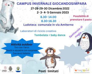 Al via i due campi invernali Magic Winter e Giocando s’impara, un calendario di attività ludico sociali promosse dall’Amministrazione comunale attraverso l’assessorato alle Politiche Sociali per bambini dai 3 ai 12 anni, finanziate con le risorse del Fondo Famiglia e realizzate in collaborazione con Chieti Solidale srl, il Centro Danza e Sport Asd. Fitto il calendario degli eventi, previsti dal 27 al 31 dicembre e dal 2 al 5 gennaio dalle ore 8 alle 16, con possibilità di orario continuato e pasto; diversi i luoghi dei laboratori e delle attività all’aria aperta: dalla sede del centro giochi “Bambini in Centro” in viale Amendola, a quella della ludoteca di via Amiterno, nonché quella dell’associazione Country House in via Campana 25 (zona Madonna del freddo), il Museo delle Scienze Biomediche in Piazza Trento e Trieste e la sede AVIS in via Principessa di Piemonte n 16 (zona Trinità). Per iscrivere i bambini le famiglie dovranno compilare un modulo scaricabile dal sito del Comune di Chieti, scegliendo di aderire ad uno o all’altro campus. Si ringraziano il CRAD dell’Università D’Annunzio Ch/Pe e l’AVIS Provinciale. “Si arriva al 5 gennaio – spiega l’assessore alle Politiche Sociali Mara Maretti, motore dell’iniziativa con la consigliera delegata alla Famiglia, Valentina De Luca – con una proposta diffusa sul territorio e che prevede tante possibilità di intrattenimento dei ragazzi e di sostegno per le famiglie durante i giorni di vacanza natalizia. Ci sono laboratori ludici, tombolate, lezioni di danza e attività motoria dentro e outdoor, piccoli corsi di recitazione, di fai da te, di gioco, di reading, persino un corso con addestratori cinofili per chi ha animali di compagnia in casa. Tutto questo per impegnare e divertire chi vorrà aderire, si parla di bambini dai 3 ai 12 anni e di un’offerta varia proprio per rispondere alle esigenze di ogni fascia di età. Per fruire di questi servizi è indispensabile iscriversi e prenotare come indicato nelle locandine che illustrano le attività, perché i posti sono limitati, ma siamo certi di poter dare una risposta concreta all’esigenza di moltissime famiglie e di farlo con la qualità e l’entusiasmo che caratterizzano tutti i partner del Comune per questa speciale rassegna”.
