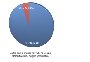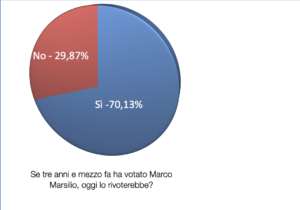 I successivi due quesiti, strutturati in maniera alternativa, vanno a stimolare una riflessione sulle scelte fatte con il voto regionale dell’11 febbraio 2019. Si è chiesto agli intervistati che tre anni e mezzo fa hanno votato per Marco Marsilio se oggi gli confermerebbero la fiducia, e a coloro che due anni fa non lo hanno scelto come Presidente della Regione se oggi lo vorrebbero alla guida dell’Abruzzo.