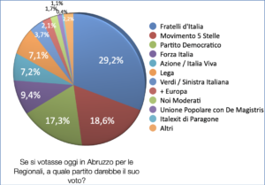 • Nell’ultimo quesito previsto dall’indagine è stato chiesto agli abruzzesi di esprimere la propria intenzione di voto rispondendo alla domanda: Se si votasse oggi per in Abruzzo per le Regionali, a quale partito darebbe il suo voto?