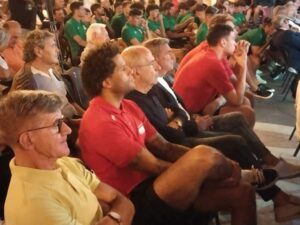 Nelle prime file i nuovi dirigenti della società neroverde, con a capo il patron Ettore Serra, staff e squadra. Particolarmente significativa la presenza di una delegazione della Mokambo Chieti Basket con il presidente Gabriele Marchesani (cui è stato donato un pallone autografato dai neroverdi), membri dello staff e alcuni atleti biancorossi, tra i quali Darryl Jackson. C’è ormai una bella sinergia tra calcio e basket teatini, già proficuamente sperimentata nel corso dell’ultima stagione, che certamente non mancherà di dare preziosi frutti. Tra l’altro quest’anno la maglia biancorossa della Mokambo avrà tocchi neroverdi.