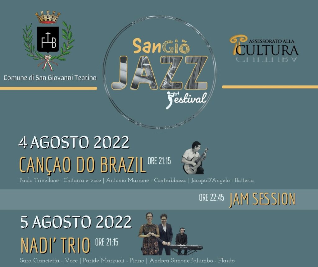 Dopo il grande successo delle scorse edizioni, dal 4 al 6 agosto torna il Sangiò Jazz Festival – Summer Edition🎷 a San Giovanni Teatino. Tre serate ad ingresso gratuito, nel corso delle quali Piazza Municipio farà da scenario a un format giovanile e accattivante, con una kermesse variegata sotto il profilo culturale. L’evento, promosso dal Comune di San Giovanni Teatino e dall’Assessore alla Cultura Simona Cinosi, è curato nella direzione artistica dei Maestri Cristian Caprarese, Luigi Blasioli e Giacomo Parone. “L’appuntamento con il Sangiò Jazz Festival – dichiara il Sindaco Giorgio Di Clemente – scalderà le prime serate di agosto a San Giovanni Teatino offrendo, come sempre, un cartellone di alto livello.” “Un festival di nuova generazione, dedicato alle nuove generazioni – spiega l’assessore alla Cultura Simona Cinosi – che propone uno spazio dedicato ai giovani talenti del nostro territorio. San Giovanni Teatino è un palcoscenico storico per il jazz e il nostro obiettivo è portare avanti questa tradizione, mettendo a disposizione del pubblico quanto di meglio hanno da offrire il panorama locale e quello nazionale”.