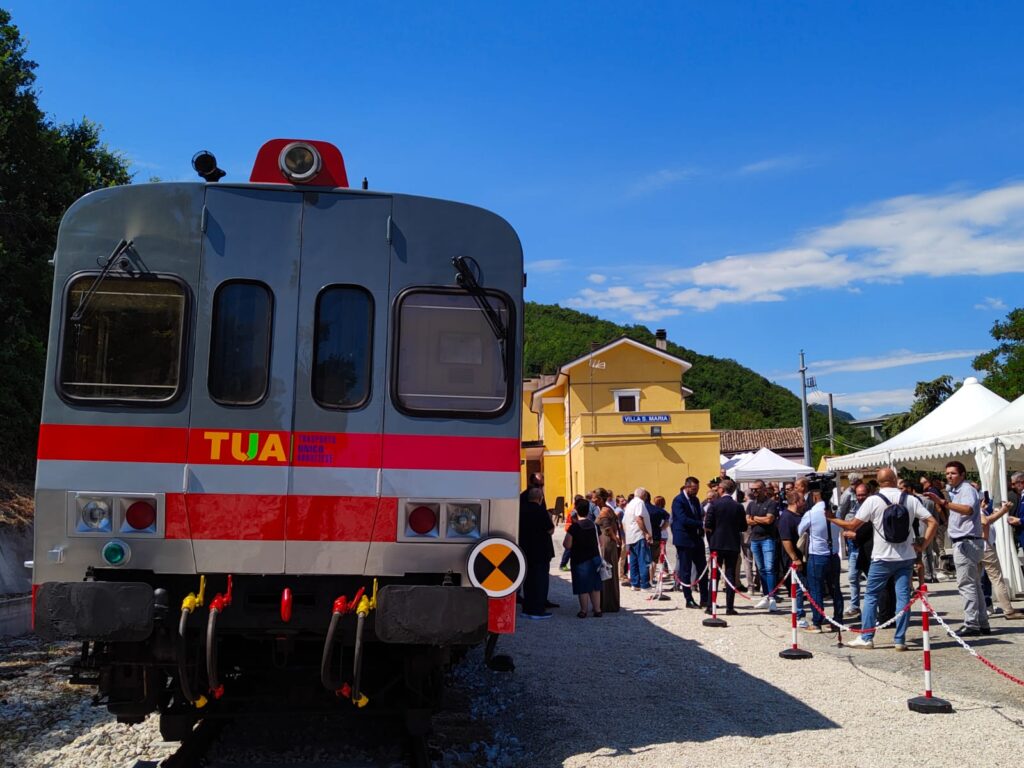 La storica stazione ferroviaria di Villa Santa Maria che accoglie un convoglio ALn 776 bicabina della TUA, partito dalla stazione di Archi, con tanto di applausi dei presenti a sottolineare l’eccezionalità dell’evento. A bordo, con i vertici della società di trasporto, il presidente della Regione, Marco Marsilio. Fila tutto liscio per la prima corsa prova realizzata da TUA il cui obiettivo è quello di testare la fattibilità di riapertura della linea ferroviaria storica Fossacesia-Archi-Castel di Sangro. Nello specifico, il test ferroviario di oggi ha visto la circolazione del treno di TUA sulla linea che collega Archi a Villa Santa Maria, lunga una ventina di chilometri; il “cuore” della tratta, quella sulla quale concentrare i paralleli progetti per una riapertura totale dell’intera linea che collega la Costa dei Trabocchi ai monti abruzzesi. Le potenzialità della tratta Fossacesia-Archi-Castel di Sangro sono riscontrabili anche nei numeri che la stessa produce: tre province coinvolte, due abruzzesi (Chieti e L’Aquila) e una molisana (Isernia), 28 comuni attraversati dalla strada ferrata e circa 1400 metri quadri interessati dalla ferrovia. Insomma, uno strumento molto interessante nell’ottica turistica della regione Abruzzo. “Occorre, innanzitutto, ringraziare quanti tra dirigenti, tecnici e collaboratori della TUA, della Regione e dei Comuni interessati si sono impegnati per rendere possibile questo primo step – ha esordito il presidente Marsilio – una corsa di prova che fa il paio con quella che abbiamo effettuato partendo da Lanciano, passando per Pescara, con arrivo alla stazione dell’Aquila, in attesa che RFI realizzi la bretella di Sulmona. Intanto, oggi abbiamo dimostrato che il tragitto che attraversa questa parte dell’Abruzzo non è più un sogno. Non a caso, – ha aggiunto – è stato già disboscato il tracciato feroviario ed è stata ripristinata la funzionalità di questa piccola stazione. C’è ancora tanto da fare come ottenere diverse autorizzazioni e sistemare dei passaggi a livello per garantire sicurezza, Con molta prudenza potremmo dire che, da qui ad un anno, saremo pronti, grazie all’impegno ed alla competenza della divisione ferroviaria di TUA, per attivare il servizio turistico anche se contiamo di farlo molto prima”. Marsilio ha poi ricordato “il grande successo che stanno riscuotendo le linee ferroviarie turistiche sulle quali lo Stato, attraverso i fondi del PNRR, ha investito molto. Un esempio virtuoso è quello della cosiddetta Transberiana d’Italia che porta centinaia e centinaia di turisti a Sulmona e nell’alto Sangro. Sono certo, quindi, che quando anche questa tratta ferroviaria che attraversa le province di Chieti e L’Aquila sarà riattivata, i Comuni attraversati, come Villa Santa Maria, si saranno organizzati al meglio in tema di attrattività turistica. C’è poi da attendere, sul fronte della viabilità stardale, la fine dei lavori della Fondovalle Sangro, frenati, al momento, da alcune difficoltà operative. Ma Anas ed impresa appaltatrice – ha aggiunto Marsilio – sono impegnate per far ripartire al più presto i lavori perchè sono certo che l’opera sarà completata, nonostante le difficoltà. Su questo non ci sono dubbi”. Il progetto ambizioso è quello di riaprire l’intera linea ferroviaria fino a Castel di Sangro dove, tra ottobre e novembre, verrà appaltato il tratto che collega il centro sangrino ad Ateleta. Un intervento, questo relativo al tratto finale della linea ferroviaria, per complessivi 14 milioni di euro di finanziamento. All’arrivo della corsa di prova del convoglia di TUA erano presenti anche il sottosegretario alla Presidenza con delega alle Infrastrutture, Umberto D’Annuntiis, e l’assessore con delega al Territorio, Nicola Campitelli. “Le potenzialità di questa ferroviaria – ha spiegato Gianfranco Giuliante, presidente di TUA – sono molto interessanti e i nostri sforzi si stanno concentrando per riattivarla. La linea che collega Archi a Villa Santa Maria è stata già oggetto di interventi mirati, tant’è che oggi è stato possibile riproporre un servizio ferroviario molto incoraggiante”. Gli interventi di TUA in ambito di divisione ferroviaria sono importanti, come spiega Giuliante. “La prima parte della tratta verso Castel di Sangro – ha affermato il presidente di TUA – è interessata da interventi tecnologici legati alla sicurezza ferroviaria, mentre l’ultima parte della ferrovia, in particolare il tratto che collega Ateleta a Castel di Sangro è oggetto di un importante intervento di 14 milioni di euro che sta verrà contrattualizzato entro il 30 ottobre”. Nel corso del secondo semestre 2022, la Divisione Ferroviaria di TUA potrà disporre anche di altre tre nuovi convogli, i nuovi Codia POP. 2.0 Coradia Stream, oltre agli interventi tecnologici sull’altra infrastruttura ferroviaria TUA, quella che collega Lanciano alla stazione interconnessa di RFI di San Vito.