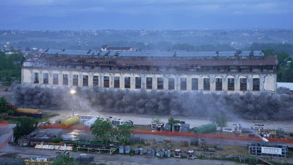 Come programmato, la struttura principale dell’ex Zuccherificio di Chieti Scalo è stata fatta brillare alle prime luci dell’alba, dopo che l’intera area attorno a via Piaggio è stata temporaneamente isolata e presidiata dalle Forze dell’Ordine. L’edificio abbattuto era il più grande tra quelli che costituiscono l’impianto industriale dismesso, oggi di proprietà del veicolo Alitec controllato da Toto Costruzioni Generali, con una superficie al suolo pari a circa 3.900 metri quadrati, lunghezza di 104 metri, altezza massima di circa 25 metri e volume di 65.000 metri cubi. È quanto si legge in un comunicato di Toto Costruzioni Generale. L’abbattimento controllato è stato innescato da una miccia detonante costituita da pentrite, che ha attivato le 1100 microcariche posizionate sui 130 pilastri portanti, con una velocità di detonazione di circa 8400 m al secondo, pari a circa 30.000 km/h. In poco più di un secondo le parti murarie ed in cemento armato dell’edificio sono collassate, rivelando lo scheletro metallico sottostante, mentre alcuni cannoni ad acqua hanno mitigato l’impatto delle polveri sollevate. L’abbattimento controllato con microcariche ha richiesto la scrupolosa redazione di un piano di demolizione molto specialistico, per garantire la sicurezza sia per gli addetti ai lavori sia per gli altri edifici dell’ex complesso industriale non interessati dall’intervento. Ispezioni approfondite e campionature eseguite nei giorni precedenti hanno escluso la presenza di sostanze nocive, come l’amianto, e sono stati installati sette sismografi per monitorare l’effetto sul vicino gasdotto Snam ed il disturbo sugli edifici di via Piaggio e sulle strutture superstiti dello stabilimento. Nell’area del dismesso complesso industriale sono infatti ubicati altri edifici, anche a pochi metri di distanza, che non hanno subito alcun danno. La struttura metallica posta all’interno dell’edificio oggetto dell’intervento verrà demolita mediante bracci meccanici muniti di cesoie dai tecnici specializzati del Gruppo Toto. Presso il Servizio gestione Rifiuti della Regione è stata intanto attivata la campagna per il recupero dei rifiuti di demolizione, che saranno selezionati ed avviati al recupero, con successivo reimpiego come “materie prime seconde”, nel rispetto delle normative ambientali. L’edificio era il cuore dello stabilimento per la produzione di zucchero estratto dalla lavorazione della barbabietola e venne realizzato nell’immediato secondo dopoguerra dal gruppo nazionale Eridania, che ha cessato l’attività al principio degli anni Settanta. La demolizione di oggi apre il campo ad ipotesi progettuali finalizzate alla riqualificazione dell’area, per i quali il Gruppo Toto ha in corso le necessarie analisi di fattibilità.