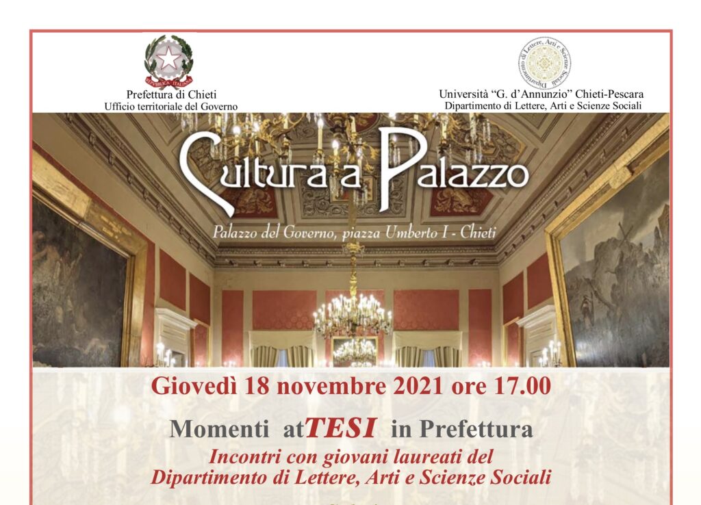 Giovedì 18 novembre alle ore 17.00 nel Salone storico della Prefettura di Chieti prende avvio il progetto Momenti atTESI in Prefettura. Incontri con giovani laureati del Dipartimento di Lettere, Arti e Scienze Sociali, nato dal felice incontro tra la Prefettura di Chieti, rappresentata dal Signor Prefetto Dott. Armando Forgione, ed il Dipartimento di Lettere, Arti e Scienze Sociali, dell’Università degli Studi “G. d’Annunzio” di Chieti-Pescara rappresentato dal suo Direttore, il Prof. Carmine Catenacci. La manifestazione, a cadenza trimestrale, prevede l’esposizione, nella cornice del Salone delle Cerimonie della Prefettura di Chieti, da parte di tre giovani laureati delle ricerche confluite nelle loro tesi di Laurea, sia di Triennale che di Magistrale, incentrate su argomenti inerenti il nostro Territorio e di particolar interesse divulgativo. Il fine è quello di gratificare i neo-dottori, incentivare le ricerche su temi ed argomenti inerenti l’Abruzzo, ed in particolare la provincia di Chieti, rafforzare il legame tra la città di Chieti e l’Università. Gli argomenti del primo incontro saranno: l’architettura della Chiesa di San Francesco a Tagliacozzo – tesi di Jessica Celata (Relatore Prof. Gaetano Curzi, Presidente del Corso di Laurea in Beni Culturali, Correlatore Prof. Tomei); la classe dirigente dell’antica Teate – tesi di Francesco Di Giorgio ( Relatore Prof. Alister Filippini); il Museo open-air di Tornareccio con i suoi mosaici contemporanei – tesi di Deborha Pignatelli (Relatori Prof. Francesco Leone, Dott.ssa Maria Cristina Ricciardi). Coordinatrici del progetto sono, per la Prefettura di Chieti, la Dott.ssa Cinzia Di Vincenzo e per il DiLASS la Dott.ssa Maria Cristina Ricciardi. L’incontro è aperto al pubblico (i posti sono limitati ed è richiesto il green pass) previa registrazione via email all’indirizzo prefettura.chieti@interno.it che fornirà risposta dell’avvenuta prenotazione.
