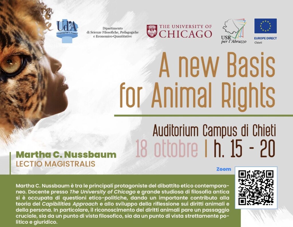 Lunedì 18 ottobre, alle ore 18.00, presso l’Auditorium del Rettorato dell’Università nel Campus universitario di Chieti, interverrà in collegamento dall’Università di Chicago Martha Craven Nussbaum. La filosofa americana terrà una lezione dal titolo “A new Basis for Animal Rights”, che aprirà il ciclo di conferenze dal titolo “La filosofia di fronte al mondo. Europa e nuovi diritti tra uomo e natura”, curato da Oreste Tolone. La conferenza si aprirà con il saluto del Rettore dell’Università degli Studi “Gabriele d’Annunzio” di Chieti-Pescara, Sergio Caputi, della Direttrice dell’USR Abruzzo, Antonella Tozza, del Direttore Dipartimento di Scienze Filosofiche, Pedagogiche ed Economico Quantitative dell’Ateneo, Tonio Di Battista, e del Presidente di corso di Laurea Adriano Ardovino. L’incontro con la Nussbaum varrà come aggiornamento per i docenti delle Scuole Superiori. La lectio magistralis potrà essere seguita anche a distanza, su piattaforma zoom o su canale youtube. Martha Nussbaum è una delle più grandi filosofe viventi e tra le principali protagoniste del dibattito etico contemporaneo. Ha insegnato classici e filosofia presso la Harvard University, presso la Brown University e infine presso The University of Chicago, dove è docente emerito di Law and Ethics. Grande studiosa della filosofia greca e latina, si è occupata di questioni etico-politiche, dando un importante contributo, con Amartya Sen, alla teoria del Capibilities Approach, allo sviluppo della riflessione sui diritti animali e della persona. Ha ricevuto 64 lauree honoris causa ed è stata insignita di innumerevoli premi. I suoi campi di riflessione sono molteplici. Innanzitutto ha avuto il merito di riconoscere e dimostrare il ruolo centrale delle emozioni per lo sviluppo di una personalità completa e fiorente, criticando una lunga tradizione filosofica, incapace di cogliere il nesso profondo esistente tra razionalità ed emotività dell’uomo. In particolare nel volume L’intelligenza delle emozioni, ha compiuto un’analisi approfondita dell’amore, della compassione, integrata in opere successive con quella di altre emozioni sensibili come il disgusto, la vergogna, e della fragilità umana, come consapevolezza necessaria per lo sviluppo di una personalità felice. Inoltre, si è concentrata sul tema della giustizia globale e sulla necessità, in una società multiculturale. Ha posto, infine, con forza la questione femminile – a cui ha dedicato una serie di importanti ricerche – e animale. Negli ultimi anni, in particolare, ha affrontato il tema degli animali da un punto di vista etico e della possibilità di attribuire loro nuovi diritti, evidenziando come il progredire di una tale sensibilità sia strettamente collegato alla denuncia del forte antropocentrismo presente nella cultura occidentale. Tra i suoi molteplici lavori menzioniamo, in traduzione italiana, Diventare persone (Bologna 2001), La fragilità del bene (Bologna 2004), L’intelligenza delle emozioni (Bologna 2004), Coltivare l’umanità (Roma 2006), Le nuove frontiere della giustizia (Bologna 2007), Creare capacità (Bologna 2014); Non per profitto (Bologna 2014), La monarchia della paura (2020)