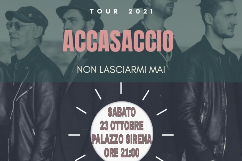 Per gli appassionati della musica di qualità, sabato 23 ottobre alle 21, gli Accasaccio si esibiranno in un concerto gratuito a Palazzo Sirena a Francavilla al Mare. La Band Salentina, che nel 2019 ha partecipato a X- Factor, proporrà al pubblico una scaletta intensa con brani inediti che miscelano ritmi patchanka-raggae a quelli folk salentini, suoni sintetici a quelli aborigeni australiani, fraseggi e ritmiche di chitarra e ukulele a quelli di un violino virtuoso e liriche melodiche e corali, energiche ed espressive con: Gianmarco Monteforte (voce, ukulele e tamburello), Emilio Maggiulli (chitarra e voce), Peppe Giannuzzi, (violino elettrico) e Diego Martino (batteria). L’ingresso è gratuito con prenotazione su https://billetto.it/…/non-lasciarmi-mai-accasaccio-band nel rispetto di tutte le regole in tema di contenimento Cov19. L’evento, organizzato dalla Power Eventi, rientra nel tour 2021 “Non lasciarmi mai” della band.