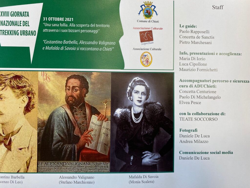 Si svolgerà il 31 ottobre la 18esima Giornata nazionale del Trekking urbano, manifestazione patrocinata dal Comune e organizzata dalle associazioni Scopri Teate e Noi del G.B. Vico, presentata stamane in Comune, in presenza del sindaco Diego Ferrara, dell’assessore a Cultura e Turismo Paolo De Cesare e di Concetta De Santis e Stefano Marchionno, a capo delle associazioni organizzatrici, della consigliera Alberta Giannini e Donato Marcotullio per la Teate Soccorso. Si prepara un percorso di circa 1,5 km, per un’ora e mezza di percorrenza all’interno della città: da piazza Valignani, al Museo Barbella, all’atrio del teatro Marrucino, fino a palazzo Massangioli. Itinerario ispirato da “Una sana follia. Alla scoperta del territorio attraverso i suoi bizzarri personaggi”, Costantino Barbella, Alessandro Valignano e Mafalda di Savoia. Quattro le partenze previste: alle 15, alle 16, alle 17 e alle 18. Per prenotarsi: 380/3428028 e 392/8990767. “Siamo riconoscenti alle associazioni organizzatrici per il lavoro di promozione della città – dicono il sindaco Diego Ferrara e l’assessore a Cultura e Turismo Paolo De Cesare. Riparte dopo lo stop del Covid una giornata di carattere nazionale che dà lustro alla città e ci sostiene nel ruolo di valorizzazione e promozione dei percorsi turistici e culturali. Bella la novità di quest’anno che vedrà interpreti tre personaggi illustri della nostra storia quali Barbella, Valignano e Mafalda di Savoia, che sarà interessante scoprire e conoscere anche nel contesto dei luoghi cittadini dove loro sono passati o dove hanno vissuto. Da qui l’invito alla città a non perdere l’occasione di partecipare a questo evento che unisce movimento, storia, turismo e anche rappresentazione, grazie allo zelo degli organizzatori che regaleranno sicuramente sorprese e curiosità al paubblico. Un evento che ci vede in tandem con il Comune di Siena, che ha ideato la giornata nazionale e siamo sicuri che ci sarà un ottimo riscontro di pubblico che potrà godere anche dei luoghi della cultura della città”. “Il percorso di quest’anno è più concentrato delle precedenti edizioni e quasi tutto all’aperto in modo da essere in linea con le prescrizioni covid – ha detto Concetta De Sanctis, dell’associazione Scopri Teate. Abbiamo scelto tre personaggi importanti per la città che si racconteranno grazie a Vincenzo Di Leo, che sarà Barbella, Stefano Marchionno che sarà Valignano e Monia Scalera che sarà Mafalda di Savoia. Barbella è un nome caro alla città, ma conosciuto meno di come meriterebbe, così come Valignano che è personaggio identitario, dalle vicende particolari, come quella di Mafalda di Savoia, perché, sebbene abbia attraversato la nostra storia per poco tempo, ha avuto un ruolo sul fronte dell’accoglienza. Tre figure di cui ci premeva raccontare, che interagiranno con le guide che avremo a disposizione, il dialogo che animerà i percorsi renderà più coinvolgente il cammino. Chi partecipa guarderà, ascolterà e conoscerà di più della nostra città”. “Proveremo a raccontare circa 6 secoli di storia cittadina partendo da Valignano e arrivando agli anni 40 del secolo scorso – ha aggiunto Stefano Marchionno dell’associazione Noi del G.B. Vico – Tutti i luoghi scelti saranno correlati ai personaggi. Io sarò Valignano, che è anche il personaggio guida di tutta la giornata perché è riconducibile a lui l’intero percorso. Ognuno dei tre ha delle particolarità nella sua storia: Valignano accusato di omicidio e mai processato perché la famiglia pagò un risarcimento alla famiglia della vittima e divenuto missionario in Giappone dove viene ad oggi ancora celebrato per aver evangelizzato il territorio nel rispetto della cultura orientale. Mafalda di Savoia si è ritrovata a Chieti dove era ospite tutto lo stato maggiore dell’esercito e i reali in fuga, ma quando si imbarcarono a Ortona, Mafalda restò a Chieti, scopriremo se sulle tracce del marito o lasciata dai genitori, di certo c’è che si occupò dell’accoglienza dei profughi che arrivarono in città”. “Barbella nacque da due genitori commercianti, un personaggio intensamente calato nella città – ha detto Vincenzo Di Leo, che ne vestirà i panni – Lo racconteremo anche per i suoi inizi di miniaturista di presepi e per la sua grande attenzione all’evoluzione della città nei suoi luoghi e con i suoi personaggi. Sarà un piccolo, ma intenso viaggio che mi piace fare anche come giovane, perché altri giovani siano attratti dall’iniziativa e partecipino, per rendere più inclusiva e ampia questa speciale giornata”.