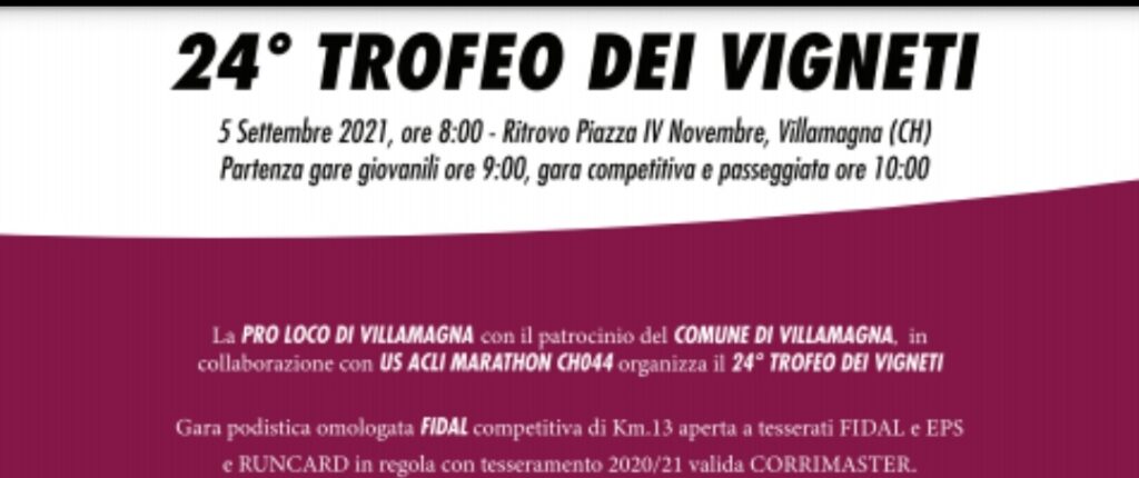 Si avvicina il periodo della vendemmia e con essa l’immancabile gara podistica di settembre in mezzo ai vigneti carichi di uva matura nel territorio di Villamagna.