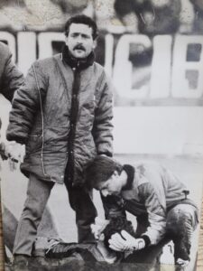 Prima esperienza professionale con i ragazzi del Sant’Anna. <Nel 1976. Nel ’77 in serie C l’arrivo al Chieti con Toni Giammarinaro allenatore. Qui ho avuto un grande maestro di fisioterapia, Doriano Ruggieri, tant’è che subito dopo dal Chieti passò a lavorare nella Lazio. Altri dai quali ho appreso tanto sono stati Mario Morelli a Roma e i fratelli Carmando. Nel campionato ’77-78 ricordo la prima trasferta a La Spezia, il ritiro a Lerici con il panfilo di Albino Buticchi parcheggiato davanti al nostro albergo. Poi, si era all’inizio del girone di ritorno, trasferta ad Arezzo, Doriano è a letto con la febbre e Volpi, che aveva sostituito Giammarinaro, mi chiama dandomi la notizia che sarei stato io il fisioterapista titolare. Da quel giorno ho cominciato a svolgere in prima persona un incarico che svolgo tuttora, pur avendo ufficialmente un’altra veste e una diversa responsabilità>.
