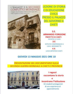 Giovedì 13 maggio, presso la sala del governo della prefettura di Chieti, si è svolta un’attività didattica di storia e di educazione civica . S.E. il Prefetto Armando Forgione e altre autorità presenti in sala, hanno incontrato gli alunni della classe 3E, scuola media G. Mezzanotte, e della classe 4 A liceo artistico di Chieti . Dopo il saluto istituzionale di S.E. e una breve presentazione da parte della Professoressa Marilisa Palazzone che ha curato tutta l’attività didattica , è stato trasmesso un documentario sulla seconda guerra mondiale a Chieti provincia frutto di una lunga e accurata indagine documentale svolta dai ragazzi. Al termine del documentario c’è stato un breve intervento su Chieti Città aperta da parte dell’Avv Antonio Palazzone. Poi la parola è stata data ai ragazzi.