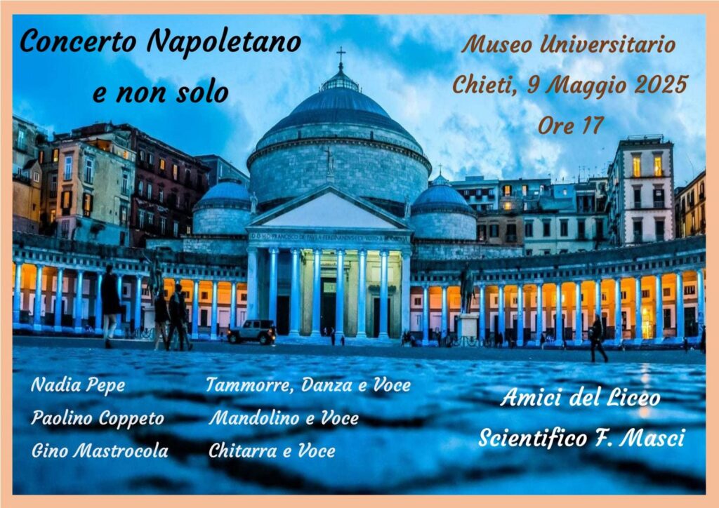 Con un concerto organizzato dall'”Associazione Amici del Liceo Scientifico Masci”, presieduta dalla Professoressa Gialloreto, torna a Chieti la musica napoletana; gli artisti Nadia Pepe, Paolino Coppeto e Gino Mastocola, conosciuti ed amati