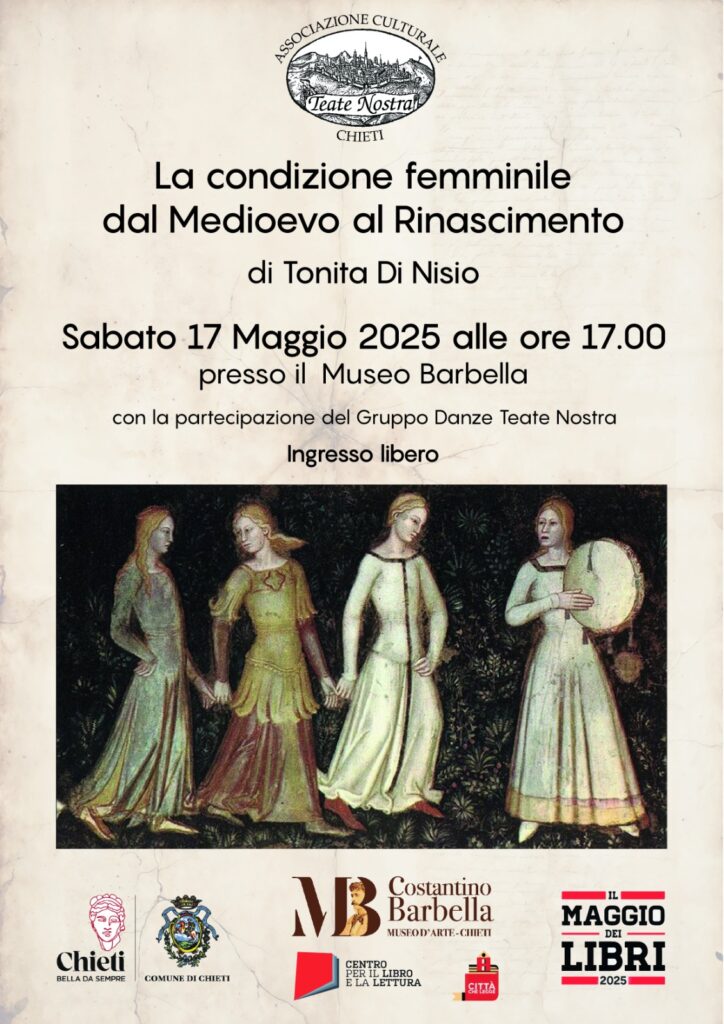 In occasione del “Maggio dei libri” sabato 17 maggio 2025 alle ore 17:00 presso il museo d’arte Costantino Barbella l’associazione culturale culturale Teate Nostra organizza “La condizione femminile dal Medioevo al Rinascimento”
