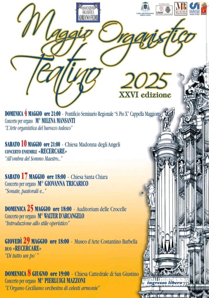 Sabato 17 alle ore 18 presso la chiesa di Santa Chiara a Chieti si terrà il terzo concerto della XXVI rassegna “Maggio organistico teatino” organizzata dalla “Associazione Organistica Adriano Fedri di Chieti”,