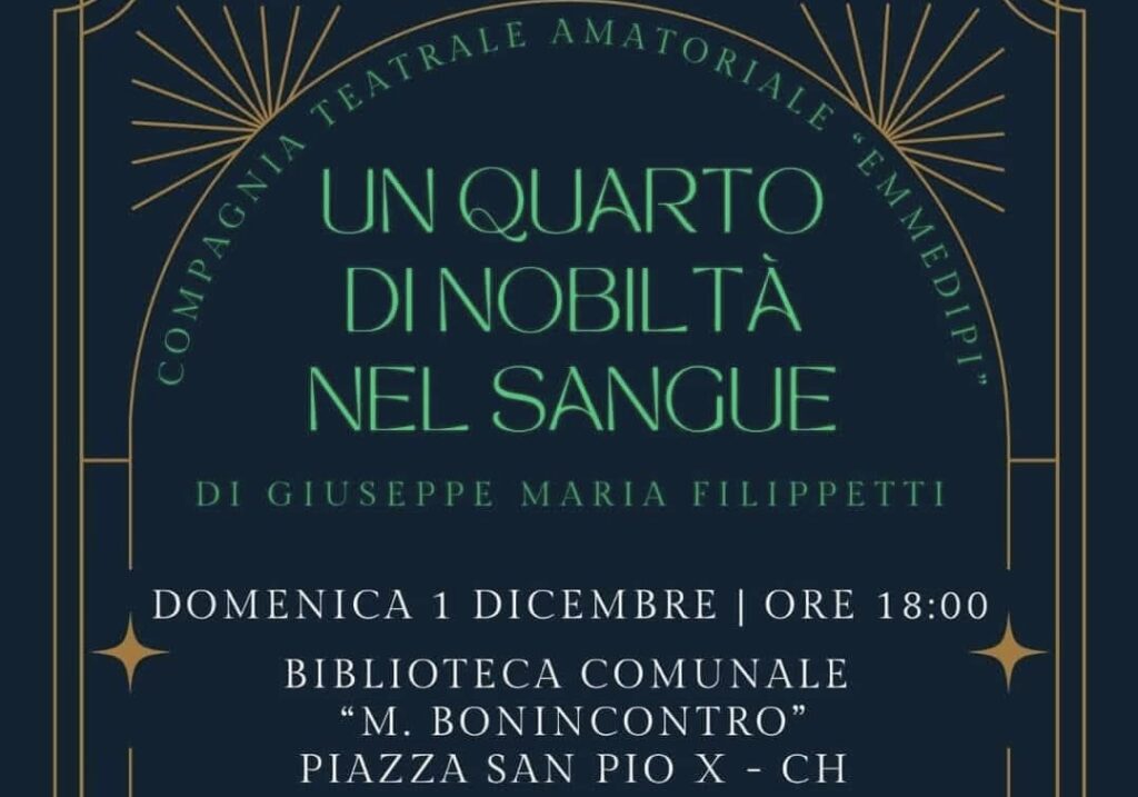 Domenica 1 dicembre 2024 alle ore 18.00 la Biblioteca comunale M. Bonincontro di Chieti gestita da Chieti Solidale Srl ospiterà la compagnia teatrale amatoriale Emmedipi diretta da Giuseppe Maria Filippetti, autore di