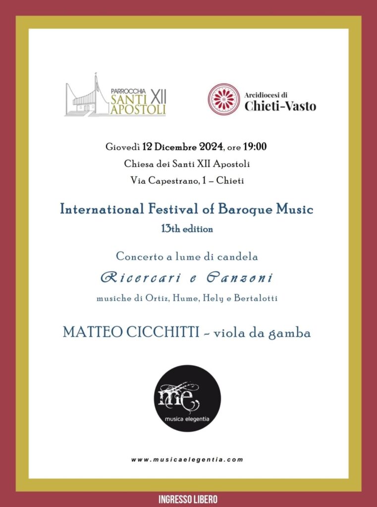 Giovedì 12 Dicembre 2024 alle ore 19:00 nella Chiesa dei Santi XII Apostoli in Via Capestrano 1 si terrà il Concerto di beneficenza “International Festival of BaroqueMusic – 13 Edizione. Si esibirà