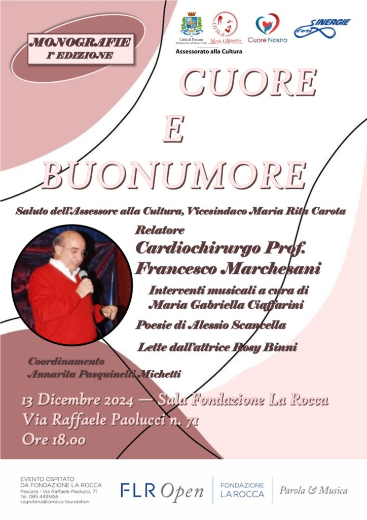 Venerdì 13 Dicembre alle ore 18 presso la Fondazione La Rocca ci sarà il secondo incontro di Monografie promosso dall ‘Associazione Sinergie Aps. Relatore d’eccellenza il Cardiochirurgo Prof Francesco Marchesani. Dirigente Medico