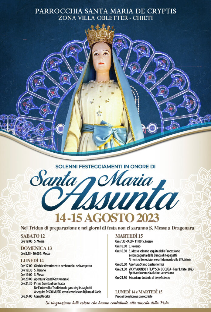 In occasione dei Festeggiamenti in onore di Santa Maria Assunta previsti per oggi e domani presso la Parrocchia di Santa Maria De Cryptis – zona Villa Obletter di Chieti, oltre alle cerimonie