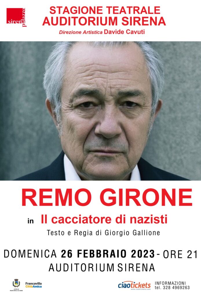 Domenica 26 febbraio, alle ore 21, Remo Girone sarà protagonista dello spettacolo «Il cacciatore di nazisti» scritto e diretto da Giorgio Gallione, a cavallo tra un avvincente thriller di spionaggio e l’indagine