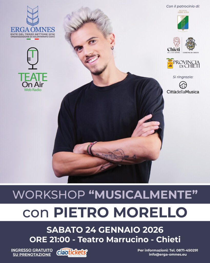 Sabato 24 gennaio 2026, alle ore 21, il Teatro Marrucino di Chieti ospiterà il workshop “Musicalmente” con Pietro Morello, operatore umanitario, divulgatore e artista tra i più seguiti e apprezzati dalle nuove