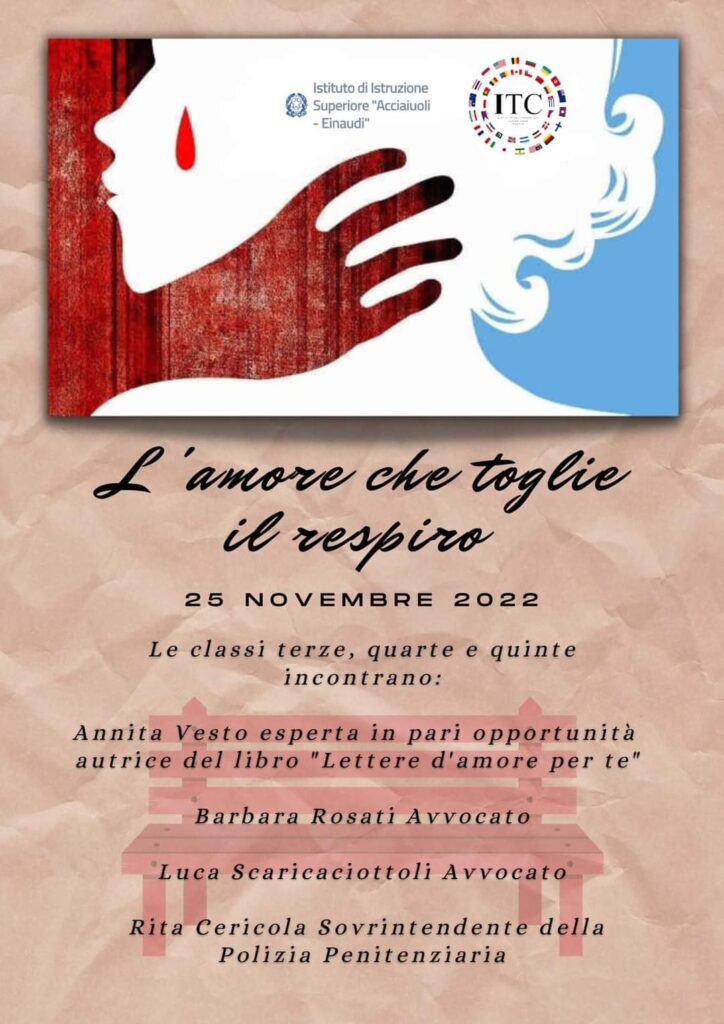 “L’amore che toglie il respiro” è il tema scelto dall’ITC Einaudi di Ortona per l’evento in programma venerdì 25 novembre riservato al triennio. Un momento di confronto e spunti di riflessione dedicato