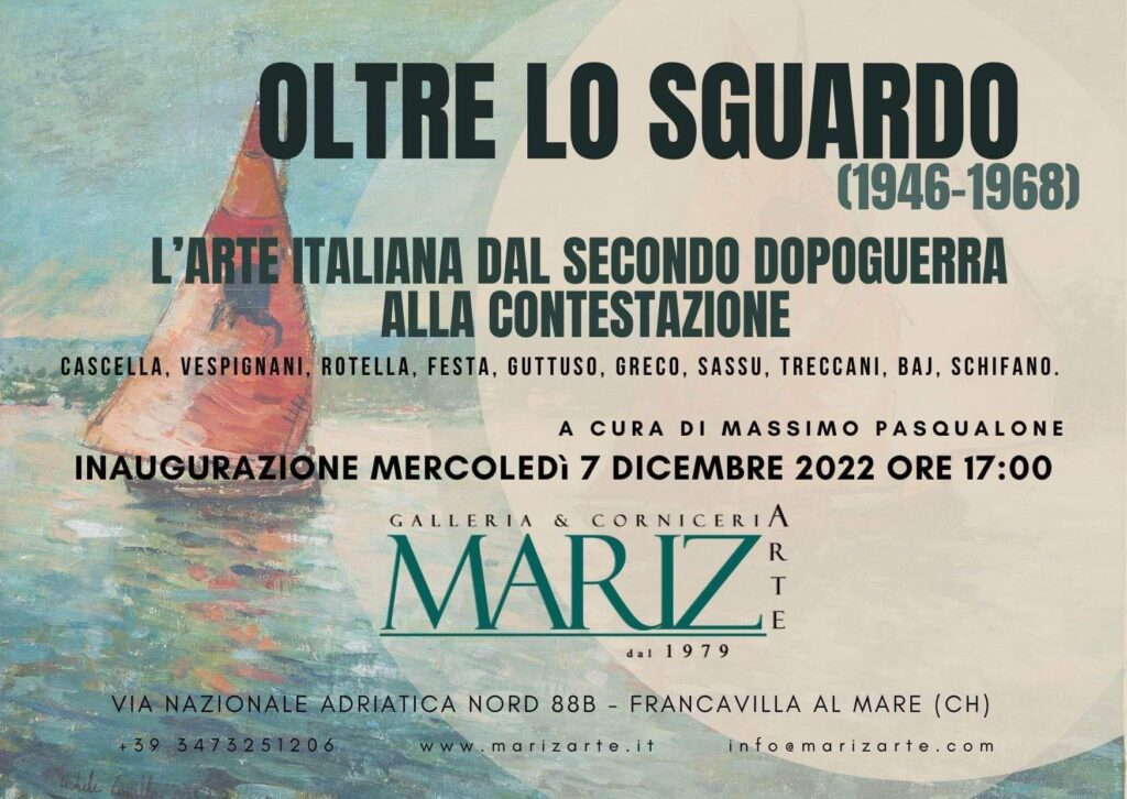Verrà inaugurata mercoledì 7 dicembre alle 17, nella galleria Mariz di Francavilla al Mare, la mostra curata dal critico d’arte Massimo Pasqualone, “Oltre lo sguardo (1946-1968) L’arte italiana dal secondo dopoguerra alla