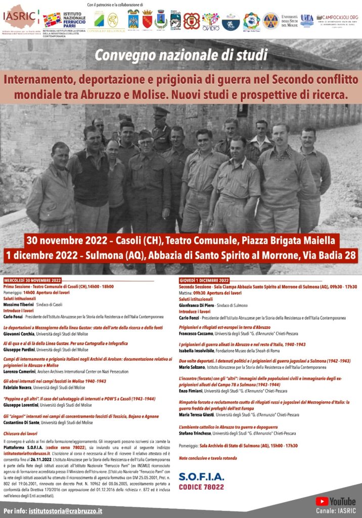 L’Istituto Abruzzese per la Storia della Resistenza e dell’Italia Contemporanea (IASRIC), promuove due giornate di incontro e studio sul tema, “Internamento, deportazione e prigionia di guerra nel Secondo conflitto mondiale tra Abruzzo