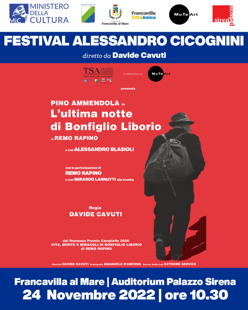 Lo spettacolo «L’ultima notte di Bonfiglio Liborio», uno spettacolo di Davide Cavuti tratto dal romanzo «Vita, Morte e Miracoli di Bonfiglio Liborio» di Remo Rapino, vincitore del «Premio Campiello 2020» edito da