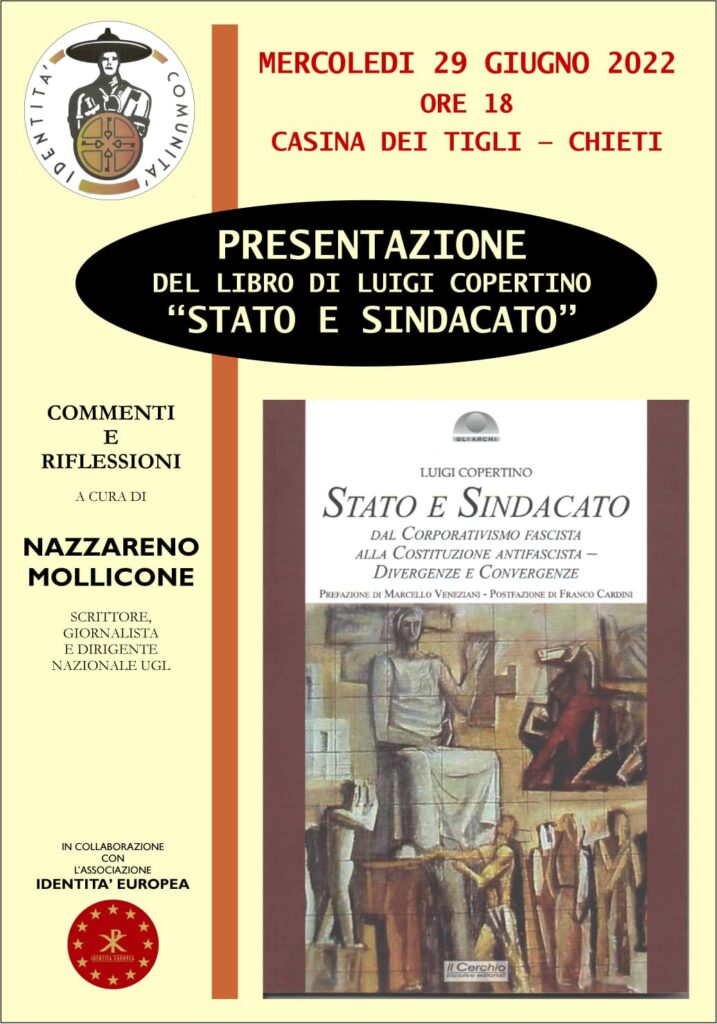Mercoledì 29 giugno a Chieti, presso la “Casina dei Tigli” in piazza Mazzini 2, zona Villa Comunale, alle ore 18:00 verrà presentato il libro di Luigi Copertino “Stato e Sindacato”. Ne parleranno