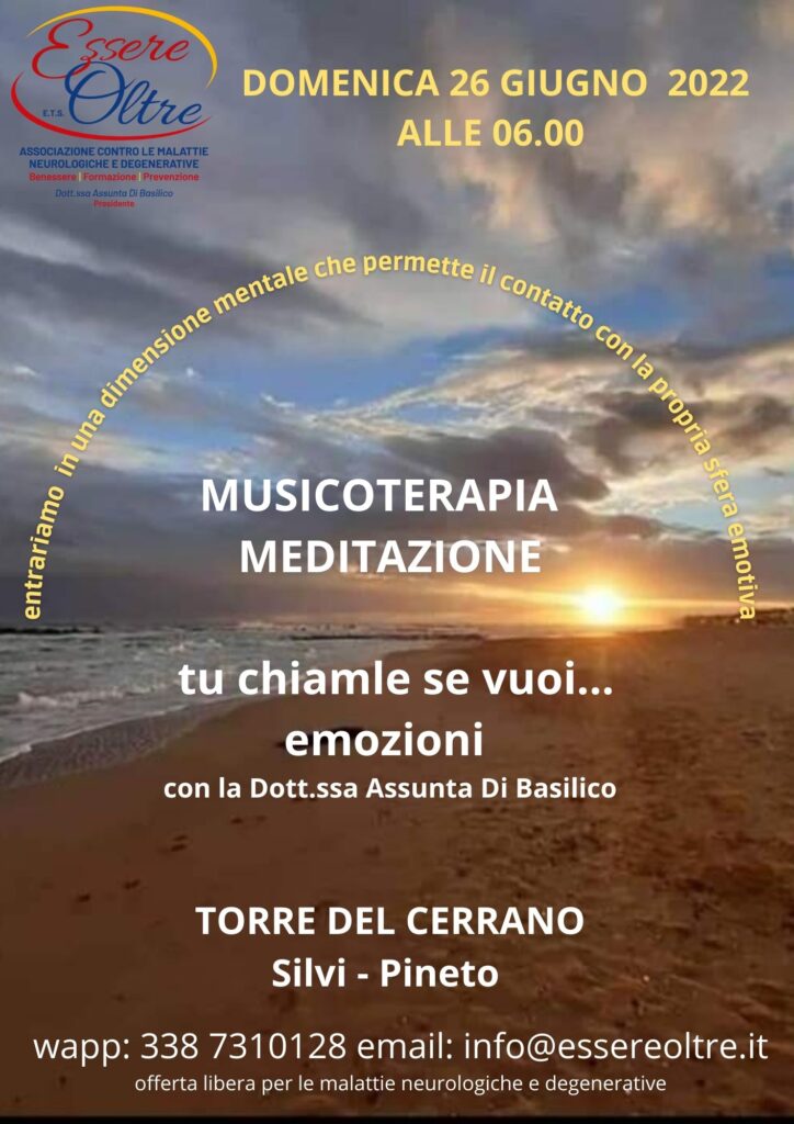 Grande emozione nell’evento di musicoterapia e meditazione tenutosi domenica 26 giugno 2022 alle ore 06.00 del mattino organizzato dall’associazione “Essere oltre”. I partecipanti, sono stati accolti lungo la sponda del mare “Torre