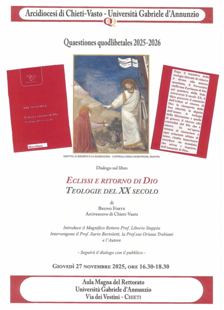 L’Università “D’Annunzio”, in collaborazione con l’Arcidiocesi di Chieti-Vasto, annuncia per il 27 novembre 2025 un nuovo appuntamento delle Quaestiones Quodlibetales 2025-2026. Al centro dell’incontro, che si terrà nell’Auditorium del Rettorato del Campus