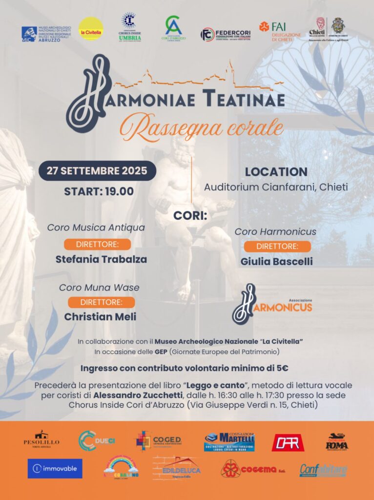 Al via sabato 27 settembre la rassegna corale Harmoniae Teatinae, che si svolgerà all’Auditorium Cianfarani dalle ore 19. L’evento è organizzato dall’Associazione Coro Harmonicus di Chieti in collaborazione con il Museo Archeologico
