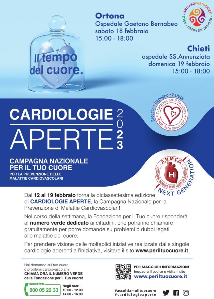 Nuovo appuntamento annuale con “Cardiologie aperte”, iniziativa che intende invitare i cittadini alla prevenzione cardiovascolare, a cura della Fondazione per il Tuo cuore insieme all’Associazione nazionale medici cardiologi ospedalieri (Anmco). La Cardiologia