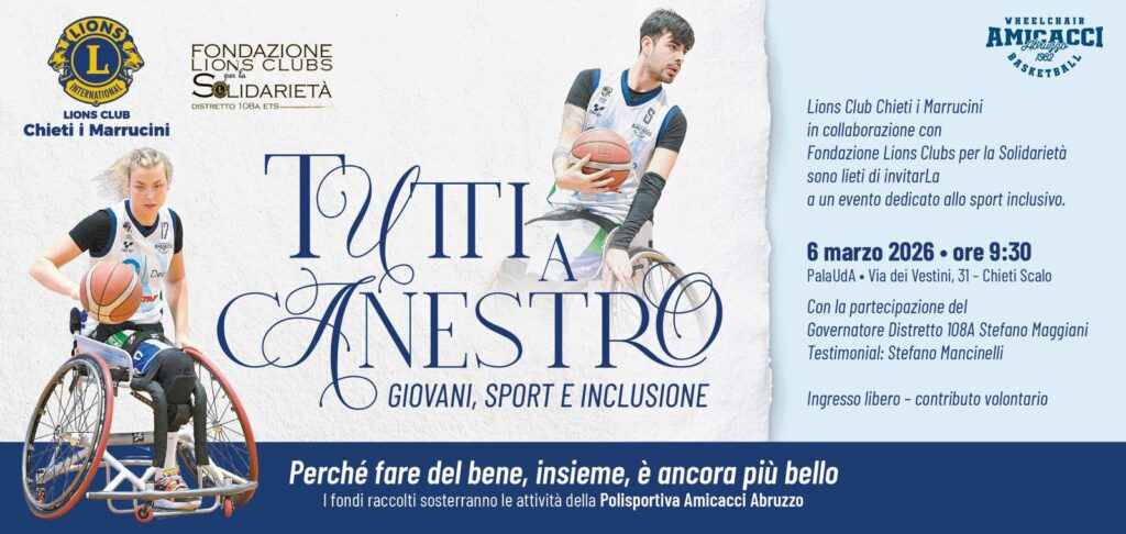 A Chieti lo sport diventa strumento di solidarietà e inclusione. Venerdì 6 marzo 2026, alle ore 9:30, il PalaUdA di Chieti Scalo ospiterà “Tutti a Canestro – Giovani, Sport e Inclusione”, un
