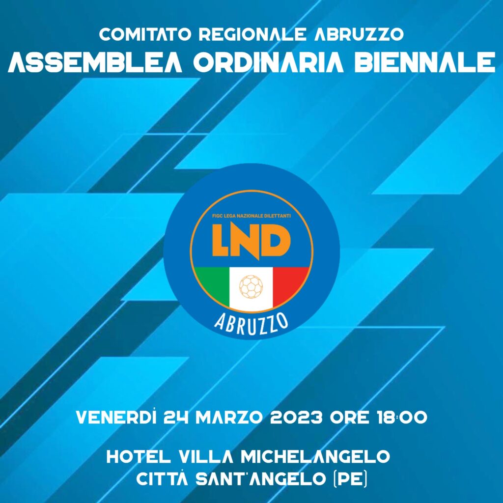 Si terrà venerdì prossimo, 24 marzo, alle 18 presso l’Hotel Villa Michelangelo di Città Sant’Angelo, l’Assemblea Biennale del Comitato regionale LND Abruzzo. All’ordine del giorno le comunicazioni del presidente, Concezio Memmo, la