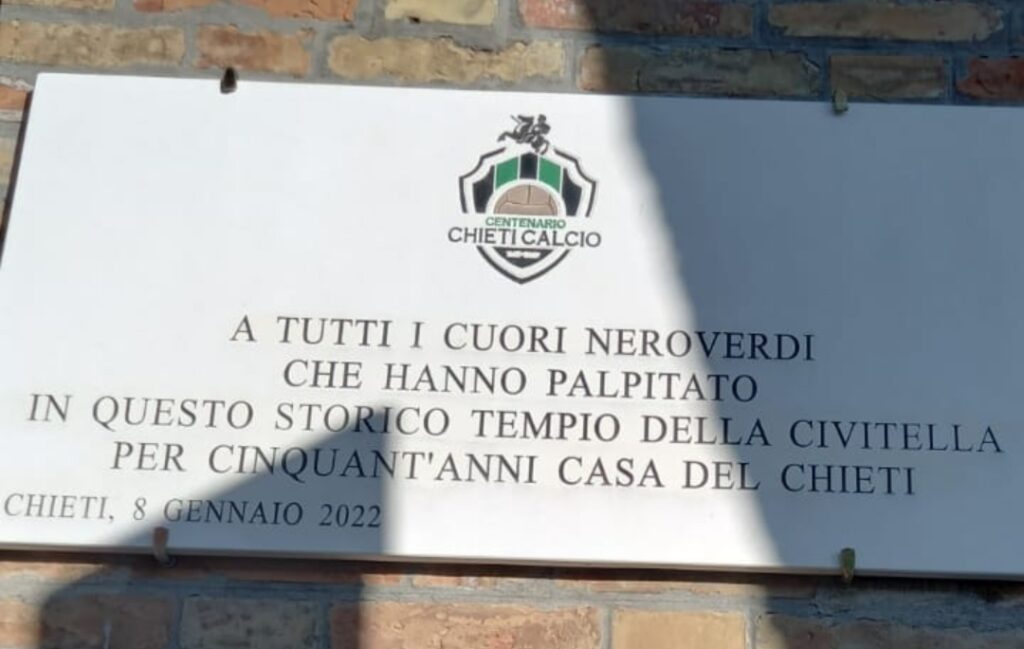 La targa collocata l’8 gennaio dello scorso anno dal Comitato del Centenario Chieti Calcio su quel che resta del muro di cinta della Civitella, in via Pianell, è stata deturpata da vandali.