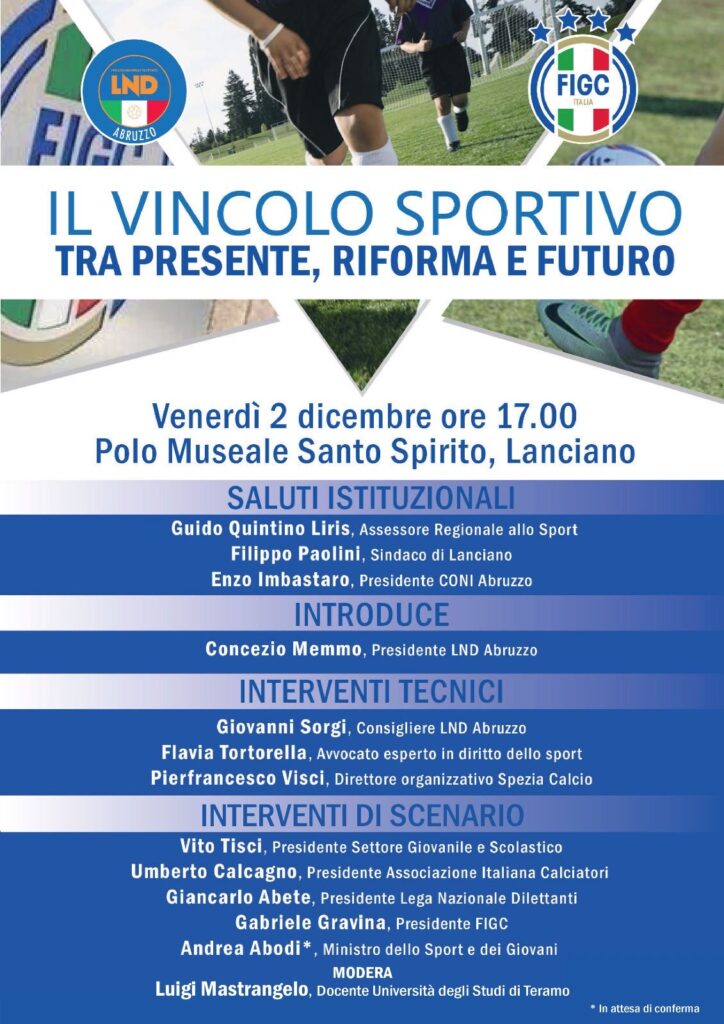 I vertici del calcio italiano venerdì prossimo a Lanciano riuniti per il Convegno nazionale “Il vincolo sportivo tra presente, riforma e futuro”, promosso e organizzato dalla LND Abruzzo. Appuntamento al Polo Museale