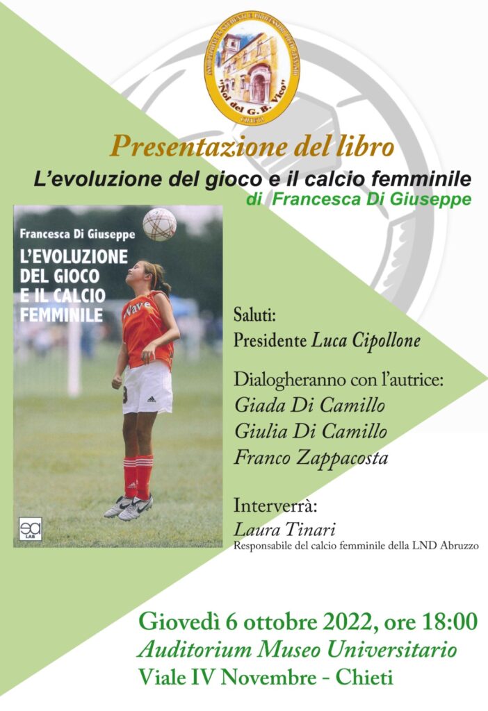 L’Associazione “Noi del G.B. Vico” organizza un incontro, giovedì 6 ottobre alle ore 18,00 presso l’Auditorium del Museo Universitario in viale IV Novembre a Chieti, sul calcio femminile insieme al giornalista teatino