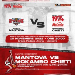 La Mokambo Chieti Basket recupera domani la prima delle due partite rinviate. I biancorossi saranno di scena a Mantova (“Grana Padano Arena” ore 20.00). La squadra di coach Rajola riprende il cammino dopo la seconda pausa nel giro di due settimane (slittato al 30 novembre anche il match in calendario domenica scorsa contro Chiusi) ben decisa a conquistare il primo successo esterno contro un Mantova che ha gli stessi punti in classifica e, analogamente, due partite da recuperare. La compagine virgiliana allenata da coach Valli sembra (in teoria…) abbordabile.