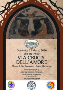 Domenica 22 marzo 2026, alle ore 19, la chiesa di San Domenico in Corso Marrucino ospiterà la seconda edizione de “La Via Crucis dell’Amore”, iniziativa promossa dall’Associazione Culturale Teate Nostra e inserita nel programma della Peregrinatio della Croce dell’Amore 2026. L’evento prevede una rappresentazione mimata delle stazioni della Via Crucis, con la partecipazione attiva del Circolo Giovanile Santa Barbara, del gruppo Scout CH1 e dei Cantori della Passione di Santa Barbara, che accompagneranno la serata con l’esecuzione di brani tradizionali della Passione.