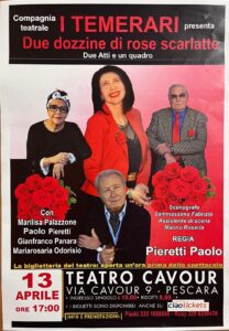 Il giorno 13 aprile alle ore 17:00 presso il teatro Cavour di Pescara la compagnia de “I Temerari” presenterà la commedia dal titolo: “ Due dozzine di rose scarlatte” in due atti e un quadro scritto da Aldo De Benedetti e interpretato in maniera magistrale da : Marilisa Palazzone, Paolo Pieretti, Gianfranco Panaro e Mariarosaria Odorisio. E’ un classico della commedia degli equivoci , uno spettacolo elegante, condito da umorismo raffinato . E’ una di quelle piéce argute che funziona da più di settant’anni e che è uno dei più rappresentati in Italia. Spettacolo da non perdere! La Compagnia, con la stessa commedia, sarà il primo giugno al teatro Marrucino di Chieti.