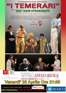 Per gli appassionati del teatro dialettale, invece, si segnala la commedia” Ddu rape strascinate”sempre rappresentata dalla compagnia de: “ I Temerari “ che si esibirà al teatro Marrucino in data 26 aprile.