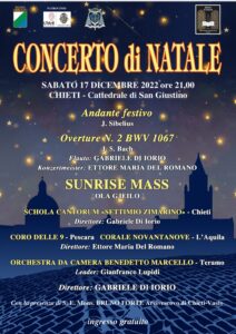 Grandi sono le emozioni previste in occasione del Concerto di Natale 2022 che illuminerà la maestosa Cattedrale di San Giustino di Chieti sabato 17 dicembre alle ore 21, un appuntamento immancabile per la città teatina che è rappresentata dalle voci della Schola Cantorum “Settimio Zimarino” diretta dal Maestro Gabriele Di Iorio che anticipa: “Sono particolarmente felice di dirigere questo concerto che prevede un programma ed una formazione straordinari. Si tratta di un progetto regionale. Forse per la prima volta in Abruzzo è nata una collaborazione tra associazioni corali ed orchestrali”. Parteciperà all’evento anche Sua Eccellenza Monsignor Bruno Forte Arcivescovo di Chieti – Vasto.